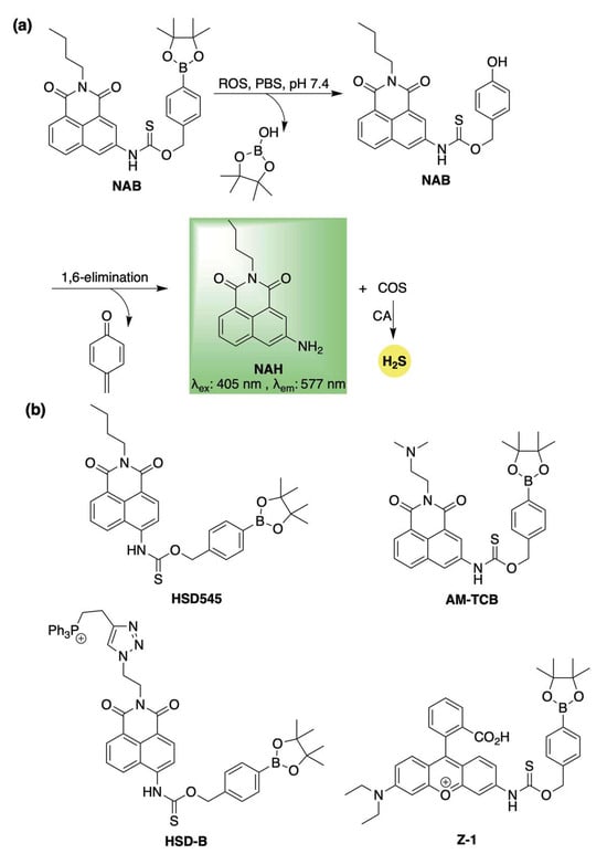 Among the first to leverage this concept, Ma and co-workers introduced NAB—an ROS-responsive H2S donor featuring an off–on fluorescent response [80]. NAB was designed by masking a naphthalimide-based fluorophore (NAH) as a thiocarbamate, linked through the benzylic position of an arylboronate group (Scheme 7a). Upon exposure to ROS, the boronate ester is oxidized to a phenol [81], triggering a 1,6-elimination cascade that releases COS—rapidly converted to H2S by CA—along with the fluorescent reporter (Scheme 7a). H2S release from NAB was confirmed using the methylene blue assay, although less than 20% efficiency was observed after 7 h. Despite the modest yield—likely a result of the oxidative conditions required for H2S release—NAB’s built-in fluorescence proved to be a valuable feature for real-time monitoring of reaction progress. Indeed, the authors showed that conversion of NAB to NAH could be easily tracked by fluorescence spectroscopy, with the initial rate of increase in fluorescence directly proportional to H2O2 concentration. This highlights NAB’s potential for both qualitative and quantitative H2O2 detection alongside controlled H2S release. Additionally, cell imaging studies confirmed selective activation of NAB in response to elevated ROS levels, enabling targeted H2S delivery. Moreover, its anti-inflammatory properties were further demonstrated in PMA-stimulated RAW264.7 macrophages, where NAB was shown to provide concentration-dependent cell rescue from oxidative stress.