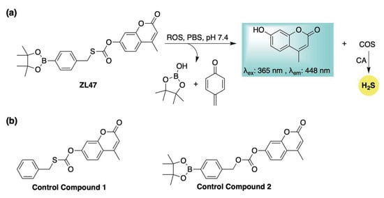 Building on these previous designs, our group developed an ROS-activated, COS-based donor system (ZL47, Scheme 8a) capable of real-time fluorescence reporting of H2S release [89]. Distinct from earlier ROS-responsive donors, ZL47 features an S-alkyl thiocarbonate moiety, which enhances reaction kinetics and improves donor efficiency. To validate its stability and elucidate its activation mechanism, two control compounds were synthesized and evaluated alongside ZL47 (Scheme 8b). Fluorescence assays monitoring the release of the coumarin reporter demonstrated that ZL47 was unreactive toward biothiols and metal ions but selectively responsive to ROS (KO2, ONOO−, and H2O2). H2S generation was confirmed via a methylene blue assay, which revealed that both H2O2 (to initiate activation) and carbonic anhydrase (to hydrolyze COS) were required for H2S formation. Notably, control compound 1 (Scheme 8b) failed to produce H2S under identical conditions, further supporting the proposed release mechanism of boronate oxidation followed by a 1,6-elimination (Scheme 8a). The biological activity of ZL47 and related controls was also evaluated in HeLa cells. While both ZL47 and control compound 2 (Scheme 8b) were capable of imaging elevated ROS levels, only ZL47 conferred cytoprotective effects. This benefit is likely due to its dual function—fluorescence signaling and antioxidant (COS/H2S) delivery—highlighting the promise of ROS-activated, self-reporting H2S donors as theranostic agents for oxidative stress-related pathologies.