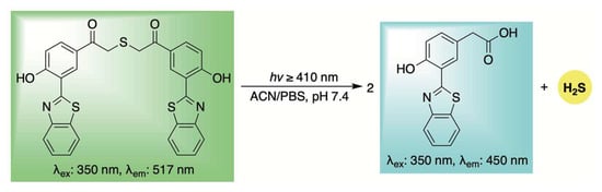This approach was first demonstrated by Singh and co-workers, who utilized an excited-state intramolecular proton transfer (ESIPT) process to develop a ratiometric fluorescent sensor for H2S release (Scheme 11) [97]. As illustrated in Scheme 11, the authors proposed that upon light exposure, a photo-induced Favorskii rearrangement occurs, leading to the release of H2S along with a blue-shifted fluorogenic byproduct. Cellular uptake of the donor was confirmed in HeLa cells via confocal microscopy, where bright green fluorescence was initially observed. Ten minutes after photoirradiation, both green and blue fluorescence were detected, indicating partial decomposition of the donor. After 20 min, a complete shift from green to blue fluorescence was observed, suggesting the reaction had gone to completion and quantitative release of H2S was achieved.