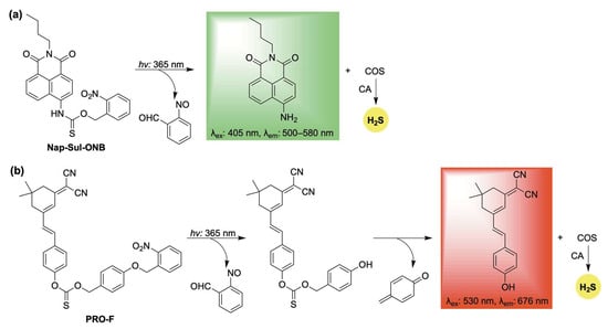 Photoactivated self-reporting donors: (a) Nap-Sul-ONB and (b) PRO-F, along with their proposed mechanisms for H2S release coupled with fluorescence.