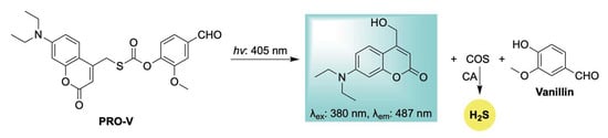 In 2025, Zhang and colleagues advanced their work on photoactivated H2S donors by introducing a new class of photocaged COS/H2S moieties featuring diethylaminocoumarin as a light-sensitive protecting group (Scheme 13) [106]. Upon blue light irradiation, these compounds release H2S through carbonic anhydrase–mediated COS hydrolysis, accompanied by fluorescence changes. The authors further demonstrated the platform’s versatility by conjugating it with pharmaceutical agents to generate light-activated, H2S-releasing hybrid prodrugs. One such example, Pro-V—a vanillin-conjugated prodrug—exhibited notable antitumor activity by inhibiting melanoma cell proliferation and promoting apoptosis. Despite these encouraging outcomes, the limited tissue penetration of blue light highlights the need for future efforts to develop photocages with red- or NIR-shifted activation profiles for broader clinical utility.
