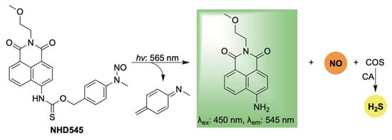 Lastly, Jiang, Li, and Zhang reported a novel photoresponsive dual-gas donor, NHD545, capable of simultaneously releasing NO and H2S via COS hydrolysis, with real-time monitoring enabled by turn-on fluorescence (Scheme 15) [108]. A key advantage of NHD545 is its ability to deliver both gasotransmitters from a single molecule, eliminating the need for separate donors. Moreover, the dual release is accompanied by enhanced fluorescence, allowing for straightforward qualitative analysis without auxiliary techniques specific to both gases. NHD545 exhibited notable anti-inflammatory effects, with both NO and H2S contributing to the regulation of superoxide dismutase (SOD) and lactate dehydrogenase (LDH) levels—highlighting their synergistic roles in inflammation modulation. In vivo studies in zebrafish further confirmed UV-triggered release of both gases, underscoring the potential of NHD545 for investigating the cooperative biological functions of nitric oxide and hydrogen sulfide.