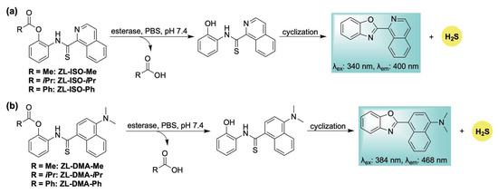 Esterase-responsive H2S donors: (a) ZL-ISO-Me, ZL-ISO-iPr, and ZL-ISO-Ph; and (b) ZL-DMA-Me, ZL-DMA-iPr, and ZL-DMA-Ph, along with their proposed mechanisms for H2S release and concomitant fluorophore generation.
