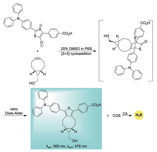 - Steiger, A.K.; Yang, Y.; Royzen, M.; Pluth, M.D. Bio-Orthogonal “Click-and-Release” Donation of Caged Carbonyl Sulfide (COS) and Hydrogen Sulfide (H2S). Chem. Commun. 2017, 53, 1378–1380. [Google Scholar] [CrossRef]