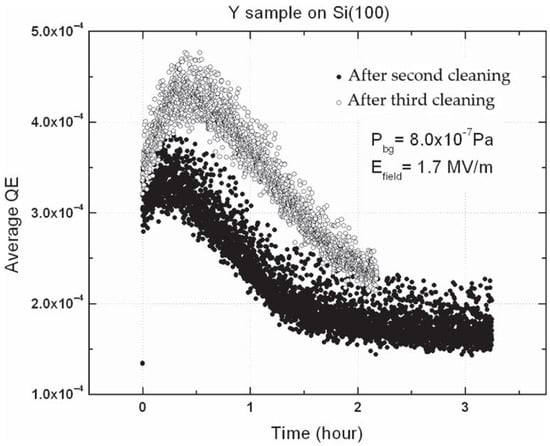 Thermal and laser cleaning treatments are the most used techniques to remove the surface contaminants from photocathodes. Other methods include mechanical, ultrasonic, and chemical cleaning [126,127], as well as hydrogen ion (H+) [128] and atomic hydrogen (H*) [129] or argon ion (Ar+) sputter-cleaning [130]. Thermal cleaning is highly effective in removing adsorbates, especially under ultra-high vacuum conditions; however, it can simultaneously accelerate the formation of oxides and hydrides due to the relatively high surface temperature. Therefore, finding a delicate balance between the desorption of atomic and molecular species and their chemical reactions with the metallic surface is crucial. The temperature of thermal cleaning technique required to remove surface contamination depends on the chemical reactivity of the material to be treated. For photocathodes based on alkaline earth metals, such as Mg and Ba, and to a lesser extent, Y, a temperature of about 200 °C is a good compromise between effective cleaning and reduced formation of unwanted oxides and hydrides on the surface [131]. On the contrary, for photocathodes based on metals with high chemical inertness, such as Cu bulk, the treatment temperature can reach 800 °C [132].