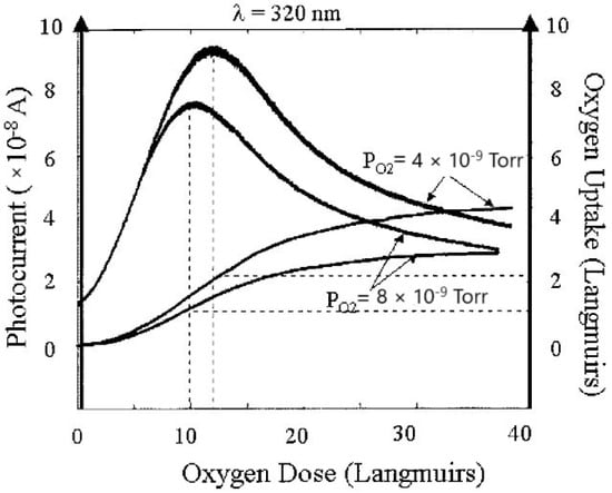 Photocurrent of the Mg bulk as a function of oxygen dose. The photocurrent axis is related to the curves, which show a maximum at two different oxygen backgrounds, while the two monotonically increasing curves refer to the oxygen uptake axis (reproduced from ref. [121]). From the figures above, one can easily deduce the influence of contaminant layers on the photo-emissive properties of both thin-film and bulk photocathodes.