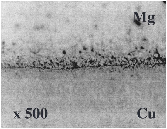Mechanical discontinuity between Mg disk and Cu bulk observed at a magnification of 500 (reproduced from ref. [140]).