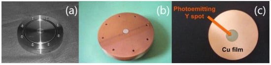 Figure 5a–c illustrate the commonly used engineered photocathode configurations. In detail, Figure 5a shows the press-fitting configuration, where a high-QE metal disk, usually Mg, Y, or Ba, is pressed into a bulk Cu disk, which is highly compatible with RF cavities. In a similar manner, a Pb disk is inserted into a Nb bulk for use in SRF cavities because of its good compatibility. Figure 5b displays the hybrid configuration, in which a high-QE thin film (Mg, Y, or Ba) is deposited on a bulk Cu substrate for RF cavities, and a Pb thin film is deposited on a Nb bulk disk to serve as a photocathode in SRF cavities. Finally, Figure 5c illustrates the non-conventional configuration, where a bulk of high-QE metal is completely covered by a thin film of Cu or Pb, except for the central part, which serves as the emitting area in RF and SRF cavities.