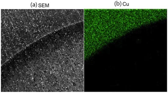 (a) SEM image of a photocathode in the non-conventional configuration at the interface between the internal photo-emitting spot of Y bulk and the external Cu film with a magnification of 50; (b) EDX map of the cathode obtained with an electron energy of 20 keV, highlighting the clear separation between the Cu film (green color) and the Y substrate (black area) in a non-conventional configuration (reproduced from ref. [22]).
