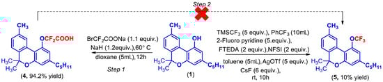 25]. This process is similar to the Hunsdiecker-type exchange of the carboxylic group in aryloxydifluoroacetic acids with fluorine. The intermediate O-carboxydifluoromethylated cannabinol (