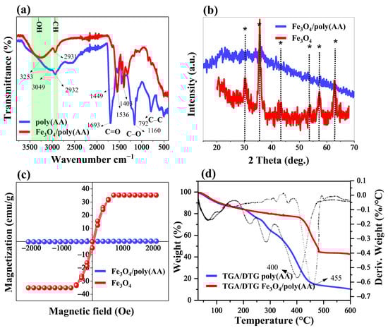 The FTIR spectroscopy was employed to characterize the functional groups present in both the poly(AA) and Fe3O4/poly(AA) hydrogels (Figure 2a). The FTIR spectrum of poly(AA) displays characteristic bands at 3049 cm−1 (–OH stretching), 2932 cm−1 (C–H stretching), and a sharp peak at 1693 cm−1 corresponding to C=O stretching vibrations. A broad band between 1160 cm−1 and 1230 cm−1 is associated with –CO stretching and –OH bending of carboxylic acid groups (–COOH), while the signal at 792 cm−1 is attributed to C–COOH stretching [21]. Notably, the absence of an absorption peak near 1633 cm−1 confirms the successful polymerization of AA via the opening of the C=C double bond. The presence of a peak at 1449 cm−1, associated with C–N stretching, indicates the effective crosslinking of AA by MBA, as also reported in previous studies [22,23]. In the spectrum of the Fe3O4/poly(AA) composite hydrogel, the –OH band appears at 3253 cm−1 with reduced intensity compared to that of pure poly(AA), suggesting hydrogen bonding between the carboxyl groups (–COOH) of the polymer and hydroxyl groups (–OH) on the surface of Fe3O4 particles [24]. The C=O stretching peak observed at 1693 cm−1 in the poly(AA) hydrogel shifts to 1536 cm−1 in the composite hydrogel, further supporting the formation of hydrogen bonds between the polymer and Fe3O4. Additionally, both spectra retain the characteristic C–H stretching peaks around 2930 cm−1. These spectral changes confirm the successful incorporation of Fe3O4 into the poly(AA) matrix and the establishment of intermolecular interactions.