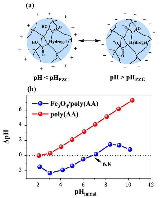 Determination of the point of zero charge (pHpzc) of the poly(AA) and Fe3O4/poly(AA) hydrogels (a); schematic representation of the surface charge behavior of the hydrogel below and above the pHpzc (b).
