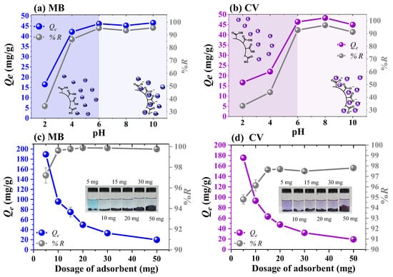 Using the proper adsorbent amount helps lower operating costs and enhances process efficiency. In this experiment, different doses (5–50 mg) of the Fe3O4/poly(AA) composite hydrogel were placed in contact with 10 mL of MB (100 mg/L) and CV (100 mg/L) solutions for 24 h at pH 6.8. The results are presented in Figure 6c,d, which show the relationship between the amount of adsorbent and the adsorption capacity. It was observed that increasing the hydrogel dosage led to an improvement in dye removal. For MB, the removal increased from 97 to 99% when the adsorbent dose was increased from 5 to 10 mg, due to the large number of active adsorption sites provided with increasing adsorbent dose [13,34,36]. On the other hand, the CV removal efficiency increased from 94% to 96% and 97% as the adsorbent dosage increased from 5 to 10 and 15 mg, respectively. Therefore, 10 mg of Fe3O4/poly(AA) hydrogel was selected as the adsorbent dosage for MB and CV removal in subsequent experiments.