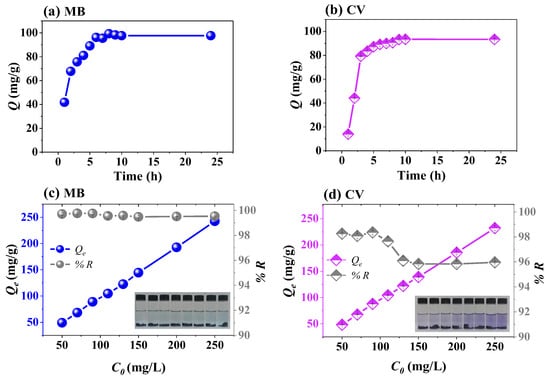 Figure 7c,d show the effect of the initial concentration of MB and CV, in the range of 50–250 mg/L, on the adsorption efficiency. A maximum removal efficiency of 99% for MB and 97% for CV was achieved throughout this concentration range using 10 mg of the adsorbent. The results indicate that there was no significant decrease in adsorption efficiency with increasing initial concentration. Even at 250 mg/L, efficiency remained at 99%, suggesting that the active sites of the material were not saturated. Consequently, no plateau was observed in the adsorption curve, and it was not considered necessary to work with higher concentrations, as the material was specifically designed for use in the treatment of textile wastewater, where dye concentrations do not usually exceed 250 mg/L. Therefore, extending the concentration range solely to achieve adsorbent saturation would not be justified from a practical and environmental point of view. This approach prioritized reflecting actual contamination conditions rather than artificially establishing theoretical parameters that might not apply to real situations.