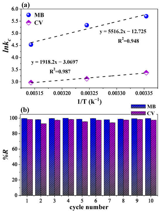 where Kc is the equilibrium constant, Ce (mg/L) is the equilibrium concentration of MB and CV, Qe is the adsorption capacity at equilibrium (mg/g), T is the absolute temperature (K), and R is the universal gas constant (8.314 J/mol·K). The values of ΔH° and ΔS° were obtained from the linear plot of ln(Kc) versus 1/T, where the slope corresponds to ΔH° and the intercept to ΔS° (Figure 8a). Table 3 presents the thermodynamic parameters derived from the experimental results.