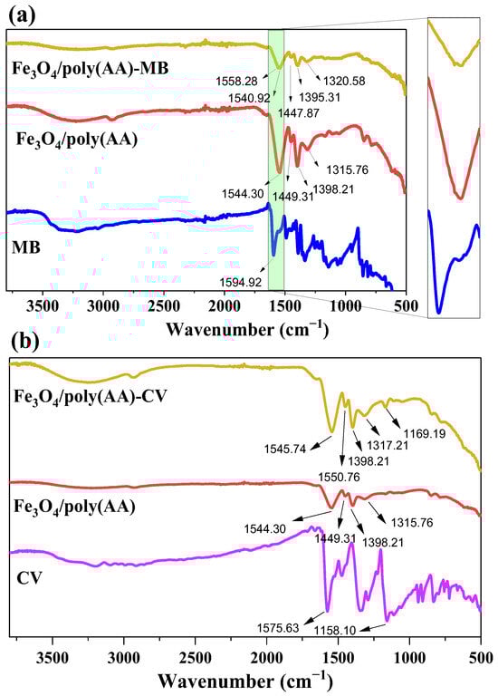 Figure 5a shows the absorbance spectra corresponding to the adsorption of MB by the poly(AA) and Fe3O4/poly(AA) hydrogels, while Figure 5b presents the adsorption spectra for CV. In both cases, a significant decrease in the intensity of the characteristic dye peaks is observed in the presence of the hydrogels, indicating effective adsorption. When comparing both materials, the Fe3O4/poly(AA) hydrogel exhibits a much more pronounced reduction in the absorbance of MB and CV compared to the poly(AA) hydrogel.