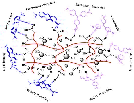 For this reason, various techniques have been developed to remove dyes from aqueous solutions, including coagulation–flocculation [5], chemical degradation [6], advanced oxidation processes [7], and adsorption [8]. Adsorption is the preferred technique due to its simplicity, low cost, and ease of design [9]. Several organic, inorganic, and hybrid adsorbent materials have been prepared, including hydrogels composed of inorganic materials such as SiO2, clay, Fe3O4, etc. [10,11]. These materials have great potential for dye removal due to the anionic groups, such as carboxylates (–COO−) or sulfonates (–SO3−), present in the hydrogel matrix, which promote electrostatic interactions with cationic dyes such as MB and CV. The large surface area and additional adsorption sites of the incorporated components contribute to a higher adsorption capacity [12].
