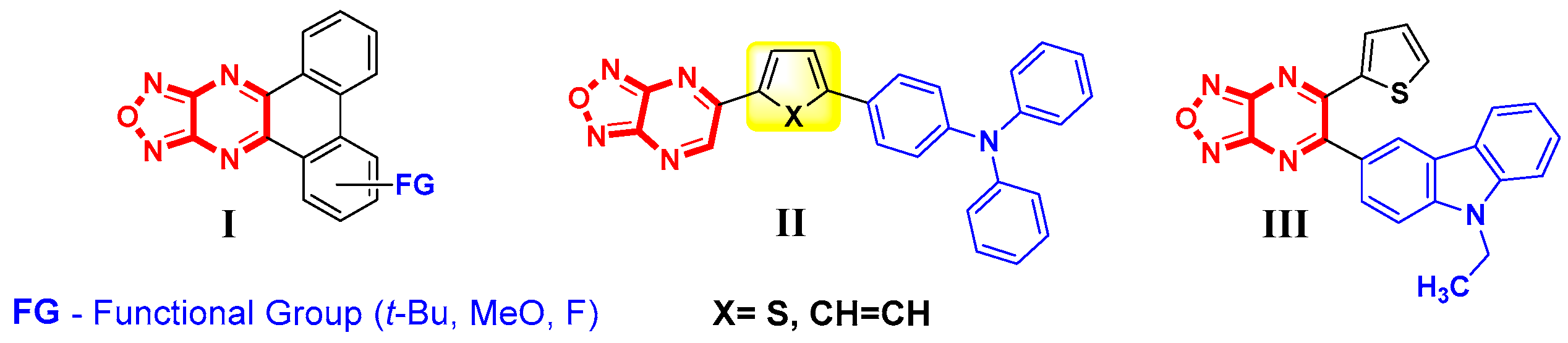 - Kvashnin, Y.A.; Verbitskiy, E.V.; Eltsov, O.S.; Slepukhin, P.A.; Tameev, A.R.; Nekrasova, N.V.; Rusinov, G.L.; Nunzi, J.-M.; Chupakhin, O.N.; Charushin, V.N. Dibenzo[f,h]furazano[3,4-b]quinoxalines: Synthesis by intramolecular cyclization through direct transition metal-free C–H functionalization and electrochemical, photophysical, and charge mobility characterization. ACS Omega 2020, 5, 8200–8210. [Google Scholar] [CrossRef] [PubMed]