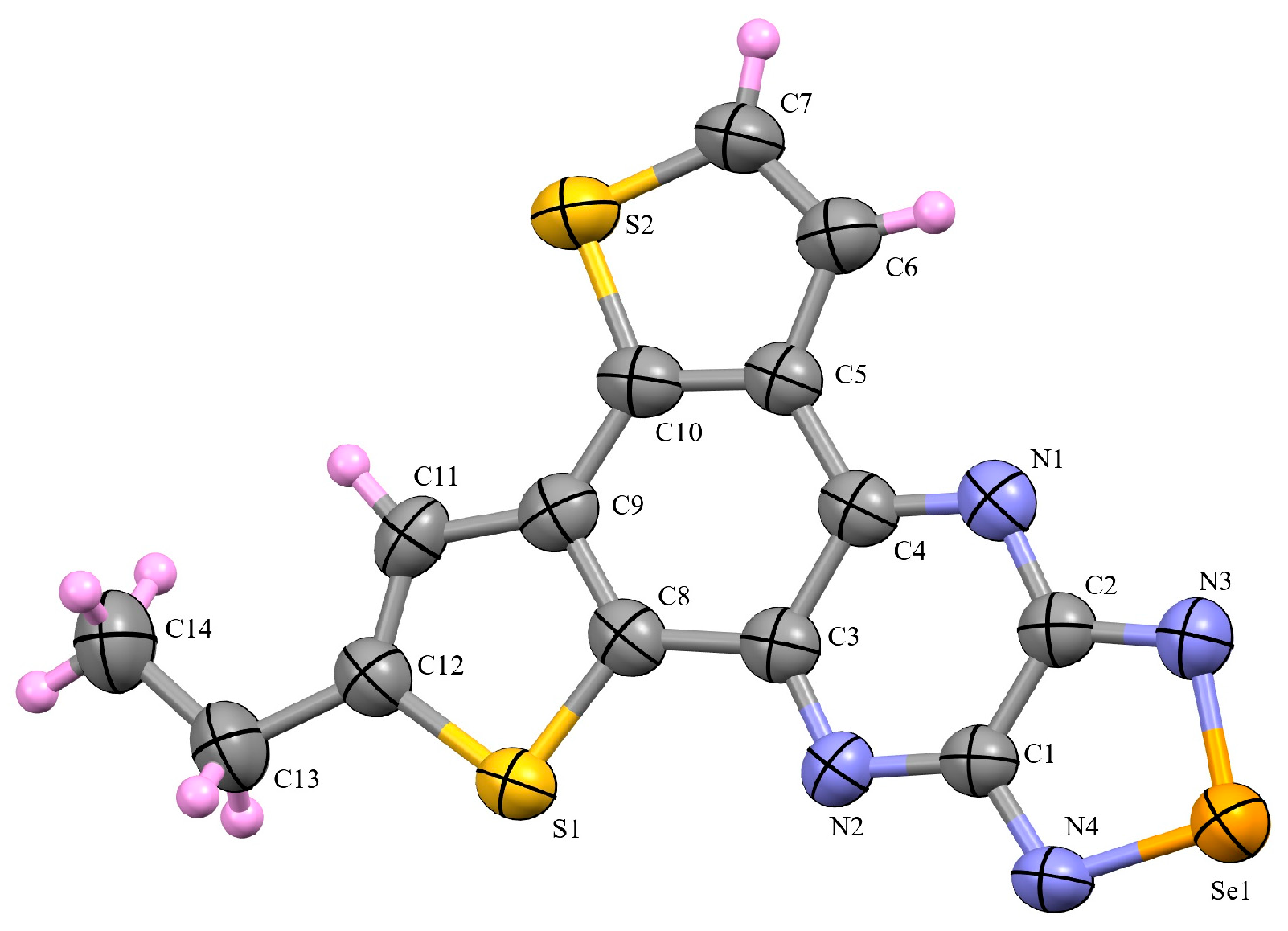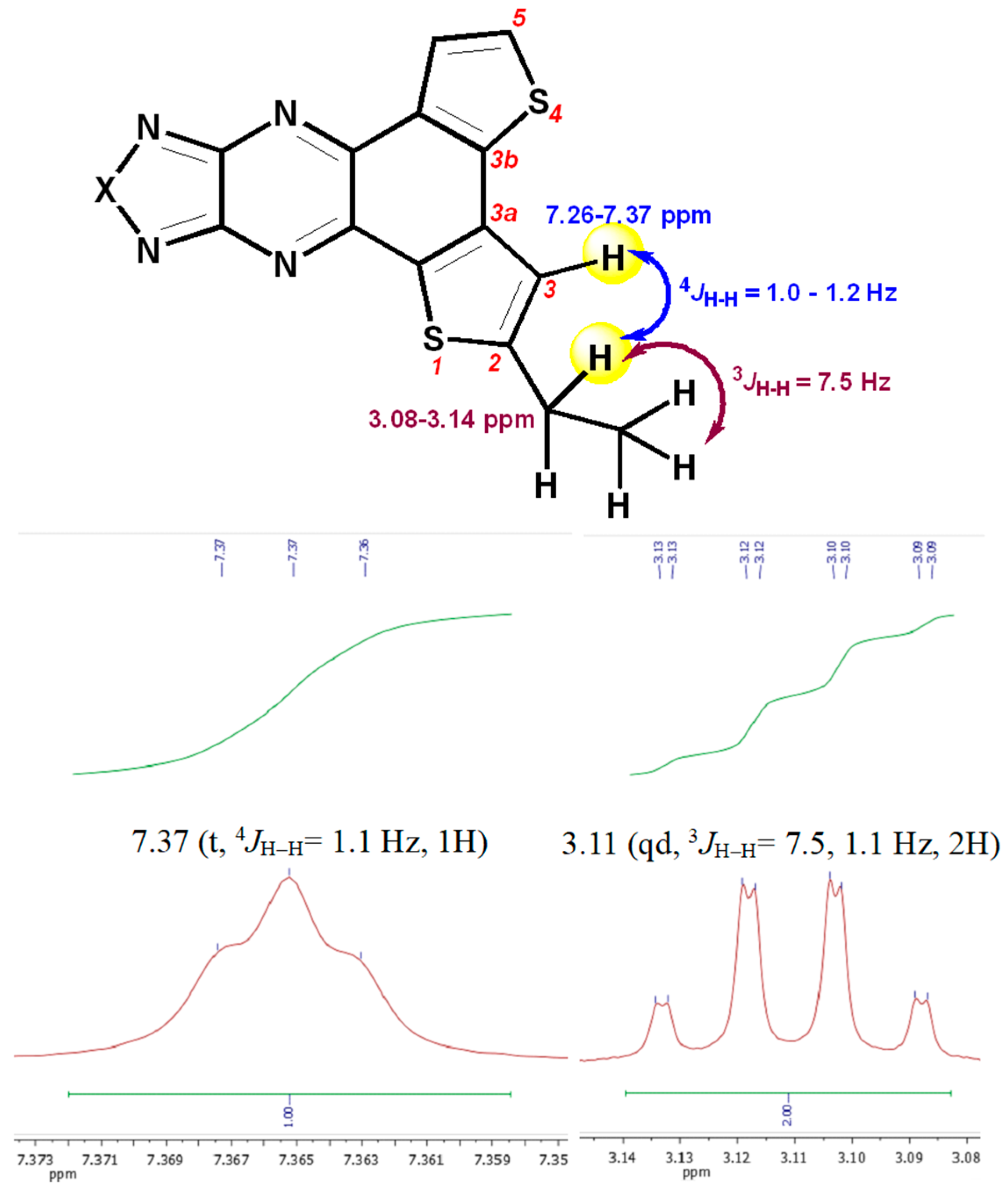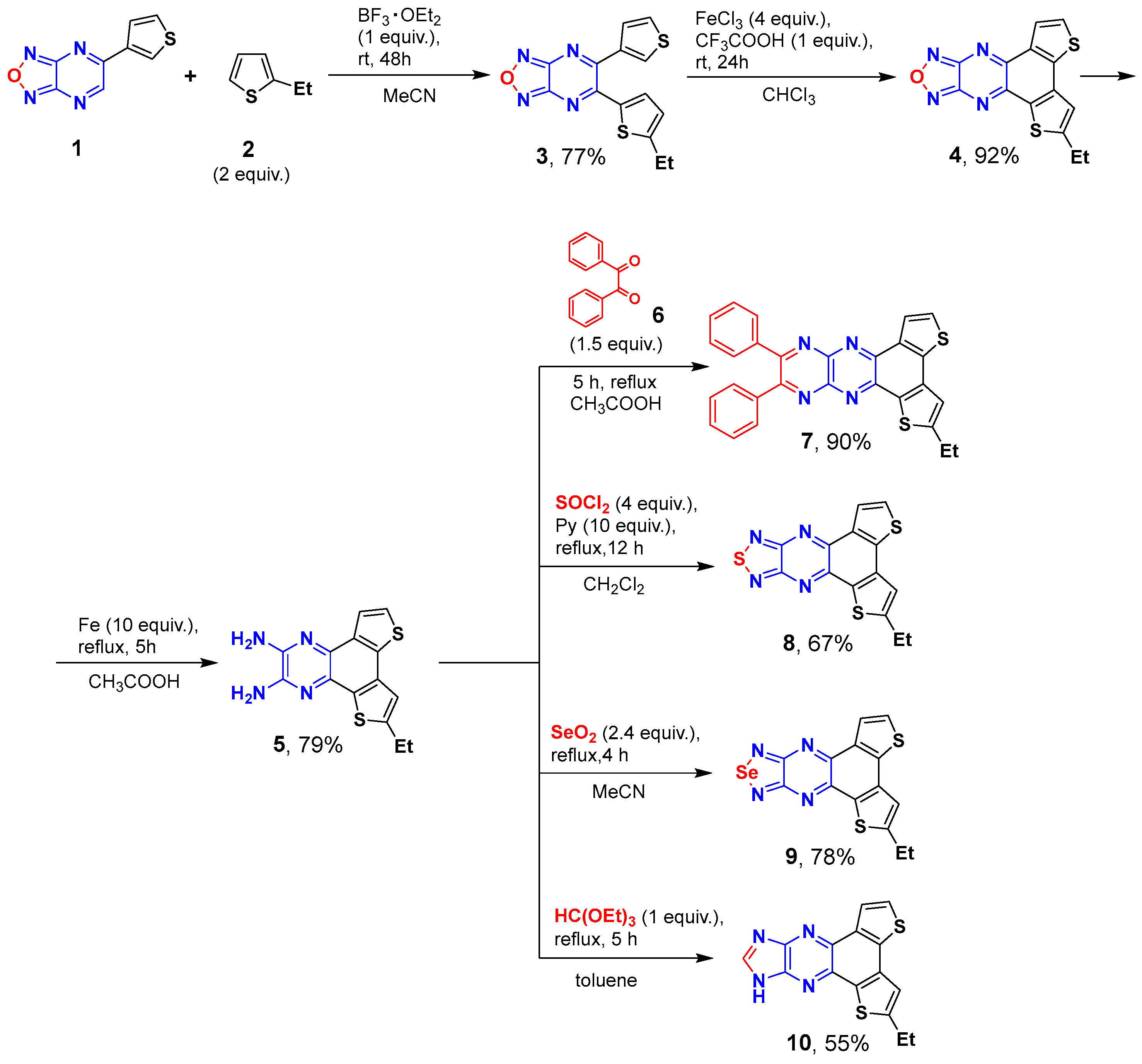 - Kvashnin, Y.A.; Krynina, E.M.; Medvedeva, M.V.; Svalova, T.S.; Kozitsina, A.N.; Eltsov, O.S.; Rusinov, G.L.; Verbitskiy, E.V.; Charushin, V.N. Synthesis of new polycyclic systems based on [1,2,5]chalcogenodiazolo[3,4-b]thieno[3,2-h]quinoxalines. Russ. Chem. Bull. 2023, 72, 939–947. [Google Scholar] [CrossRef]