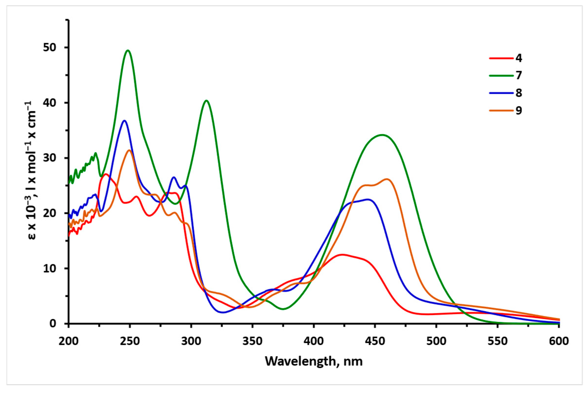 3.3. Photophysical Studies of the Polycyclic Compounds