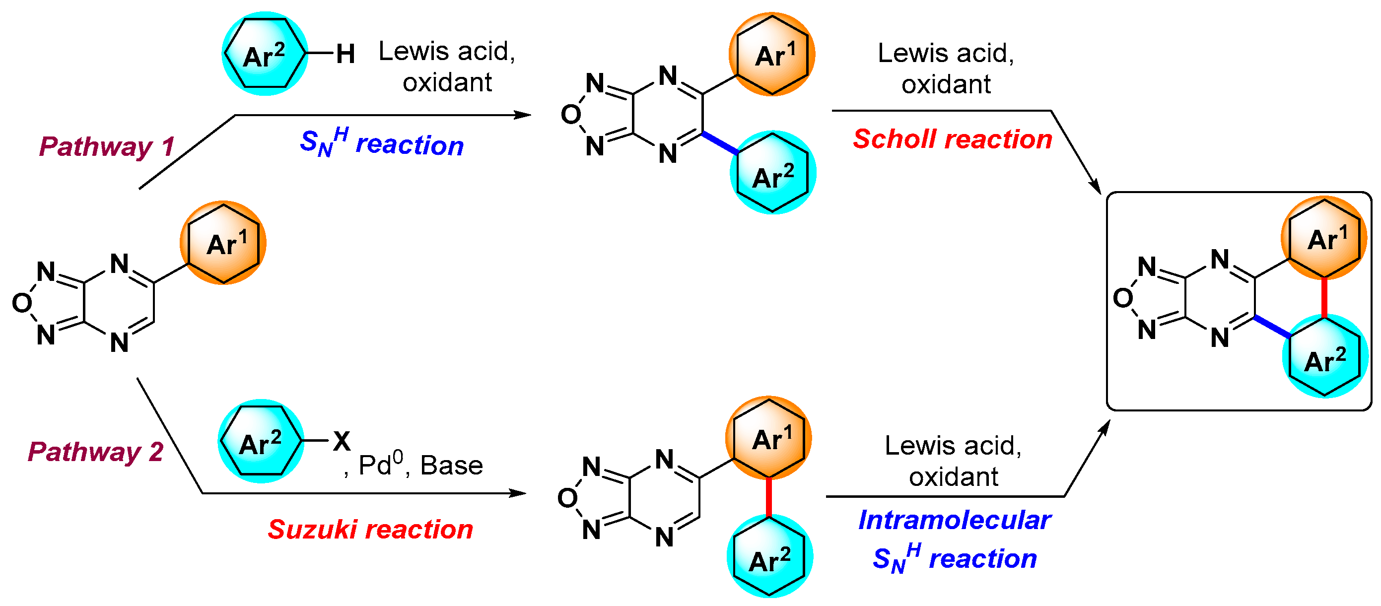 - Verbitskiy, E.V.; Kvashnin, Y.A.; Medvedeva, M.V.; Svalova, T.S.; Kozitsina, A.N.; Eltsov, O.S.; Rusinov, G.L.; Charushin, V.N. First synthesis of new polycyclic systems from ortho-di(heteroaryl)-substituted furazanopyrazine derivatives by the Scholl reaction. Mendeleev Commun. 2022, 32, 722–725. [Google Scholar] [CrossRef]