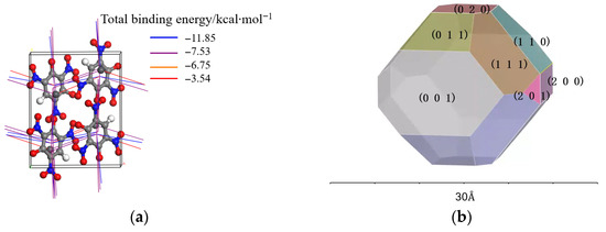 where denotes the relative growth rates of crystallographic facets within the solvent environment. The MAE can effectively predict the crystal morphology of energetic materials (such as LTNR, CL-20, FOX-7, TKX-50, and RDX) by analyzing the effects of different solvents and additives on the attachment energy of various crystal planes [21,22,23,24,25]. This model not only considers the structural factors inside the crystal but also incorporates the energy factors introduced by solvents and additives in the external environment into the calculation. This calculation method is widely used in the field of energetic materials. The results of the MAE are more accurate compared to other methods.