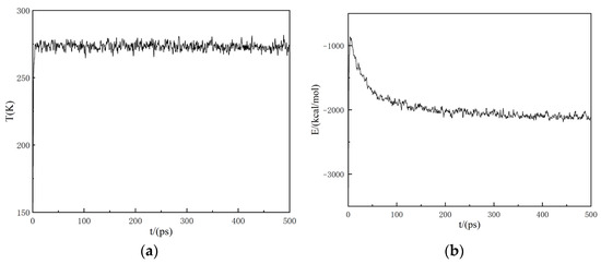 Illustrated in Figure 5 are the characteristic equilibration profiles for the ethanol (0 1 1) crystal interface system. The remarkable consistency observed in both energetic and thermal stability metrics throughout the critical 200–500 ps window not only confirms successful equilibration but also establishes the necessary thermodynamic foundation for reliable post-equilibration investigations of interfacial phenomena.