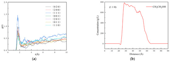 Figure 8b indicates that the ethanol density on the (110) crystal plane surface reaches a maximum value of approximately 790 g/L at 25 Å. As the distance along the z-axis increases, the concentration gradually decreases. The main reason for the higher concentration of ethanol molecules near the crystal plane is that there are small concave areas on the plane. Small molecules embed in these concave areas, thus generating a stronger interaction of solvents on LTNR surface.
