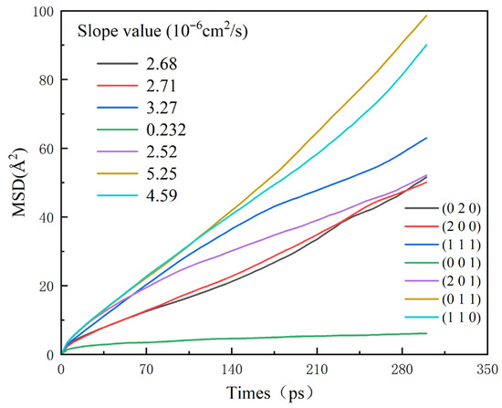 The diffusion coefficient (D) serves as a critical parameter for quantifying molecular diffusion capabilities. Derived from the Einstein diffusion equation via linear fitting of mean square displacement (MSD) data, D reveals how crystal facet structures modulate solvent diffusion behavior—thereby governing solvent-crystal interactions [37,38]. Analysis of MD simulation trajectories through MSD quantification elucidates solvent diffusion’s role in crystal morphology evolution. As shown in Figure 9, ethanol solvent exhibits facet-dependent diffusion across crystal systems. The extracted diffusion coefficients follow the hierarchy: (011) > (110) > (111) > (201) > (200) > (020) > (001). The diffusion coefficient of the (001) crystal plane is small, making it difficult for solvent molecules to leave the crystal plane and resulting in high adsorption energy. Solvent molecules are more difficult to adhere to the surface, which inhibits the crystal growth of the crystal plane.