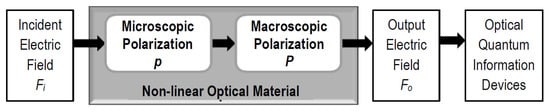 Interrelationships between microscopic (p) and macroscopic (P) polarizations of nonlinear optical materials for conversion of incident electric field (FI) to output electronic field (FO) [22,27,80]. The FO light is often used for construction of optical quantum information devices such as measurement-based quantum computation. Magnetic response terms are neglected here.