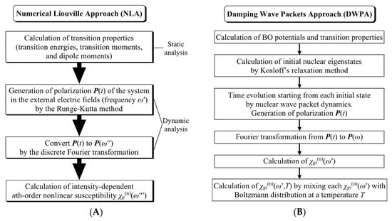 In 1994, Nakano et al. [27,122,123,124] proposed a new numerical nonperturbative approach to the n-th susceptibilities (w) in the n-th harmonic generation (NHG), which is quite different from the FLSM approach [120]. This method, referred to as the numerical Liouville approach (NLA), is based on the Fourier transformation of numerically exact solutions of the Liouville equation [122,123,124], so that it can provide both real and imaginary nonlinear optical spectra valid for arbitrary laser intensities, frequencies, and relaxation as illustrated in Figure 2A. This method is closely related to the three-step procedures of molecular orbital tomography [49,68] reviewed in Section 4. The numerical stability of the (w) with respect to the parameters used are also examined with a minimum interval of time (Dt = T/L; T = period of the external electric field and L is a division number of the period) in the time evolution of polarization P(t) and the region of time series of P(t) used in the discrete Fourier transformation. The NLA method is developed to calculate nonlinear susceptibilities summarized in Table 1.