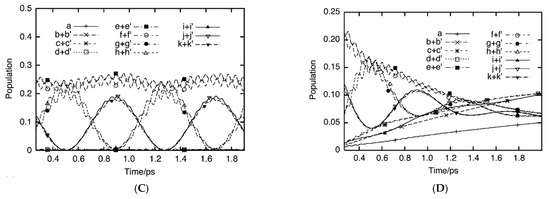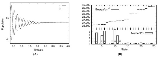 where is the Dirac constant ( is Plank’s constant), and is the reduced density matrix operator averaged over the reservoir. is the total Hamiltonian defined by Equation (9), which consists of the time-independent Hamiltonian in Equation (10) and the time-dependent Hamiltonian (=−μ for the interaction between dipole moment (μ) and the time-dependent external field in Equation (9).