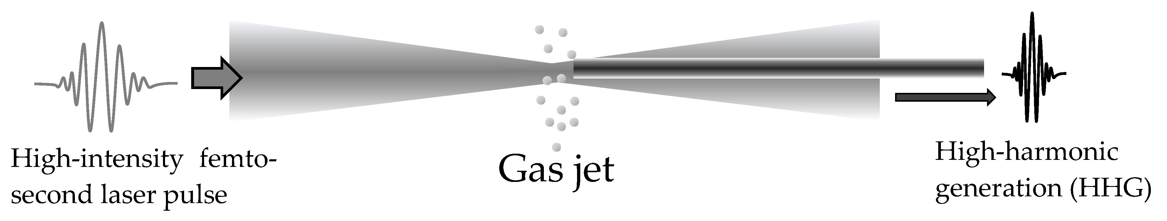 - Lewenstein, M.; Balcou, P.; Ivanov, M.Y.; L’Huillier, A.; Corkum, P.B. Theory of high-harmonic generation by low-frequency laser fields. Phys. Rev. A 1994, 49, 2117–2132. [Google Scholar] [CrossRef] [PubMed]