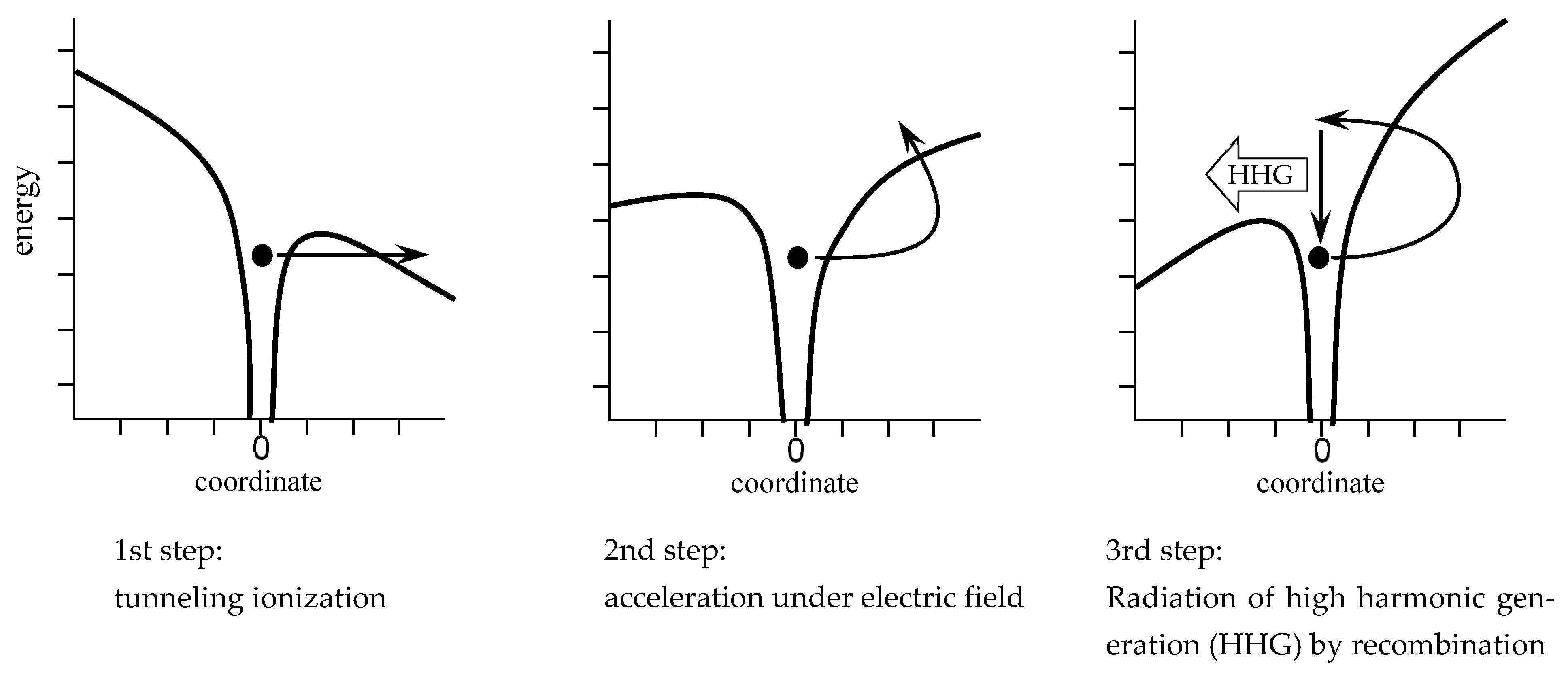 - Corkum, P.B. Plasma perspective on strong field multiphoton ionization. Phys. Rev. Lett. 1993, 71, 1994–1997. [Google Scholar] [CrossRef]
