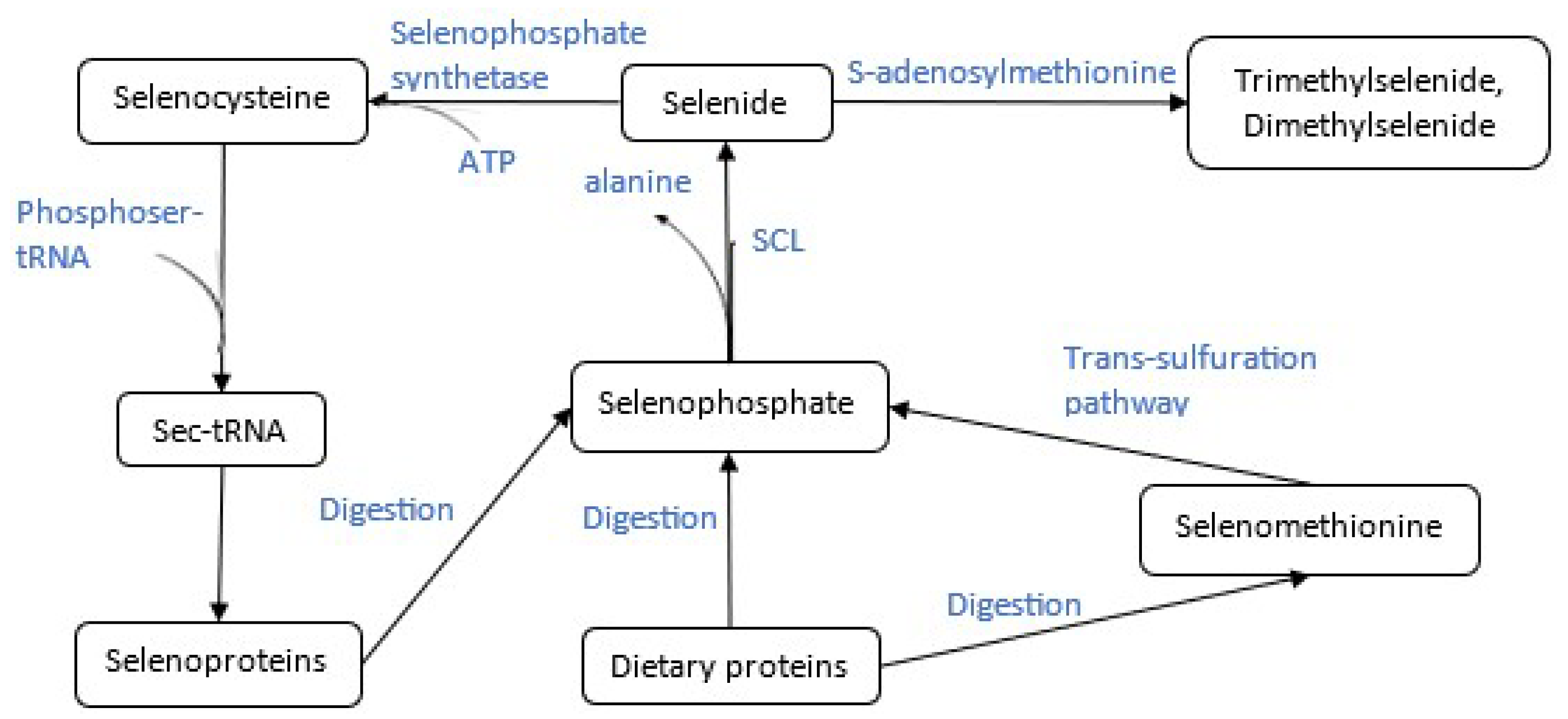 These sequential biochemical transformations alongside tightly regulated physiological mechanisms such as methylation, selenoprotein synthesis, cellular uptake, and excretion play a critical role in maintaining selenium homeostasis and preventing toxic accumulation in tissues and organs across various biological systems. Understanding these pathways is essential for developing strategies to manage selenium exposure in both environmental and clinical contexts, including the design of targeted nutritional supplementation, environmental remediation in high-selenium regions, and therapeutic interventions for selenium-related disorders such as selenosis or deficiency syndromes.