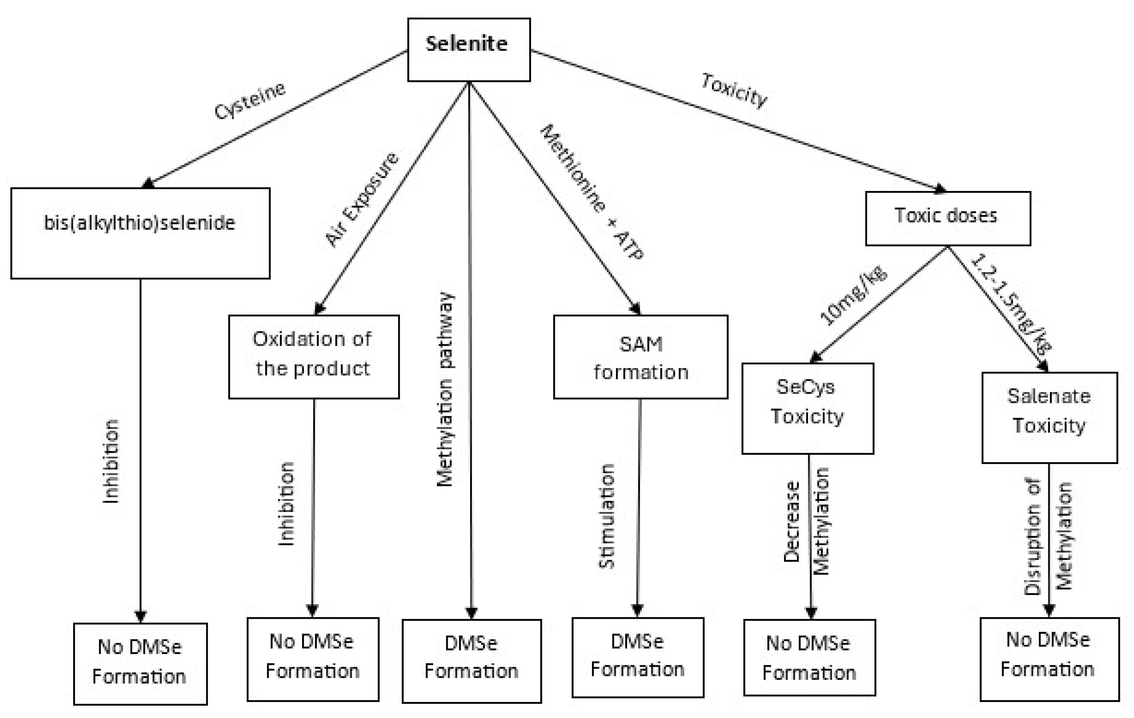 The rate limiting step in the detoxifying-methylation pathway of selenium containing compounds occurs in the methylation of selenide, which leads to the formation of DMSe [50,70,98,99,100]. In a set of studies conducted by the research group of Ganther et al. [101], it was found that the conversion of selenite to DMSe is inhibited by the presence of cysteine, presumably due to the reaction between the thiol functionality of cysteine and selenite to form bis(alkylthio)selenide. By way of their studies, it was also ascertained that the presence of S-adenosylmethionine stimulates the conversion to DMSe almost sixfold, compared to when only methionine and ATP are present as the methyl source, indicating that it is the formation of S-adenosylmethionine from methionine and ATP which is the specific rate-limiting step in the set of steps leading to the formation of DMSe (Scheme 1). In addition, it was found that the formation of DMSe requires the complete exclusion of air, presumably due to the resulting oxidation by air of the labile products produced as a result of selenium reduction. These findings were also supported by the research group of Hasegawa et al. [66], who investigated the effect of a toxic dose of selenocysteine (Sec) on the seleno-methylation pathway (Table 1; Figure 2).