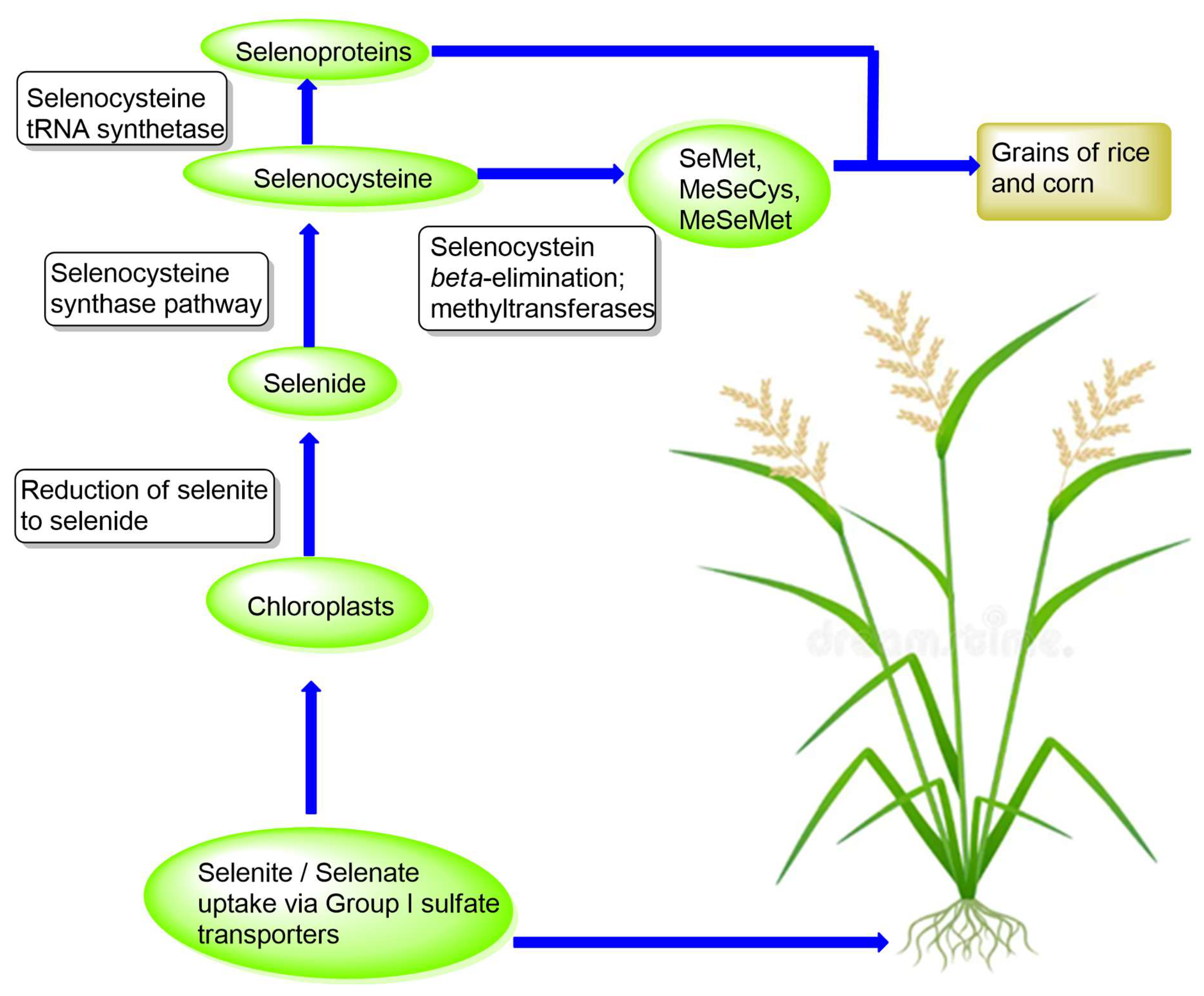 Group I sulfate transporters (SULTR 1;1 and SULTR 1;2) are most likely involved in the uptake of inorganic selenium in rice and corn plants, whereas inorganic phosphate transporters may be capable of taking up selenite at the root [121,122,123]. Selenate is transported into the chloroplasts of the plants, where it is metabolized into organic selenium. Selenate is initially reduced to selenite (Figure 2), which is further reduced non-enzymatically to the highly reactive species hydrogen selenide. Selenide subsequently enters the synthetic pathway to selenoamino acids, with selenocysteine being the first seleno-organic compound formed in the chloroplasts of the plants [115,120]. However, higher plants such as Arabidopsis thaliana and Oryza sativa (rice) lack both selenoproteins and the Sec (selenocysteine) insertion machinery, which is consistent with evidence that these components were lost during the evolutionary transition from aquatic to terrestrial environments [124,125]. In these plants, Sec is not incorporated into proteins but is instead metabolized into other non-protein selenium compounds. Alternatively, Sec is methylated to form selenomethionine (SeMet), methylselenocysteine (MeSec), or methylselenomethionine (MeSeMet) (Figure 2), with subsequent transformations leading to the formation of volatile dimethylselenide (DMSe) that is released via the stomata to remove excess selenium (Figure 2) [50,115,120]. Moreover, some SeMet and MeSec are translocated to the grains of rice and corn, serving as an organic dietary selenium source (Figure 3) [115].