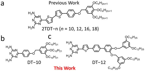 Chemical structures of (a) 2TDT−n (n = 10, 12, 16, 18) [28], (b) DT−10, and (c) DT−12 compounds.