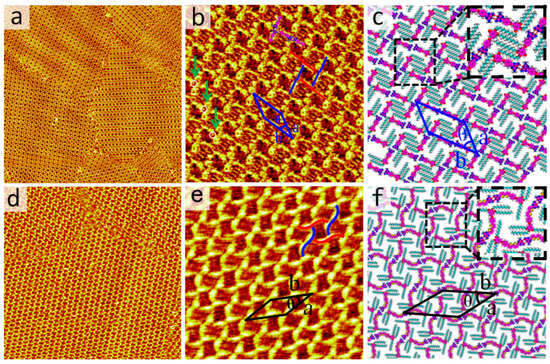 Inspired by Meijer et al. [27], and other researchers’ reports [34,35], the ratio of the side chain length to the π-conjugated backbone depends on various motifs in DT derivatives. The effect of backbone length on the self-assembled nanostructures of DT has been extensively studied. Thus, a short-backbone-length molecule, DT−10 was introduced and its self-assembly behaviors were studied. After dropping a droplet of DT−10 solution in OA solvent onto a freshly cleaved HOPG substrate, the self-assembled structure formed by DT−10 was observed using STM. The large-scale STM image clearly shows that DT−10 molecules organize into a cross-shaped pattern, as depicted in Figure 2a. The π-conjugated backbones and side chains of DT−10 molecules are distinguishable in STM images due to their different electron densities. The bright rods represent the backbones of DT−10 molecules with high electron densities, while the dark stripes indicate alkoxy chains with low electron densities. In addition, there are two cavities with brighter and darker colors. More detailed information is available in the high-resolution STM image, as shown in Figure 2b and Figure S4. It reveals that the backbones of DT−10 molecules are adsorbed on the HOPG surface and form cross-shaped arrangements. Two DT−10 molecules form a dimer with a head-to-head packing arrangement, serving as the fundamental building block for this structure. Additionally, another dimer is located at the center of the first dimer and oriented perpendicularly. Four DT−10 molecules pack in a head-to-tail manner, forming a quadrangular cavity. The brightness difference between the two cavities might be derived from extensive orientation of alkoxy chains on HOPG, which can be indicated in Figure S2. Moreover, the chiral domains were also observed in Figure S5a,b based on the relative positions of the brighter and darker cavities. It is indicated that the domains shown in Figure 2a are a conglomerate of domains with different (opposite) handedness.