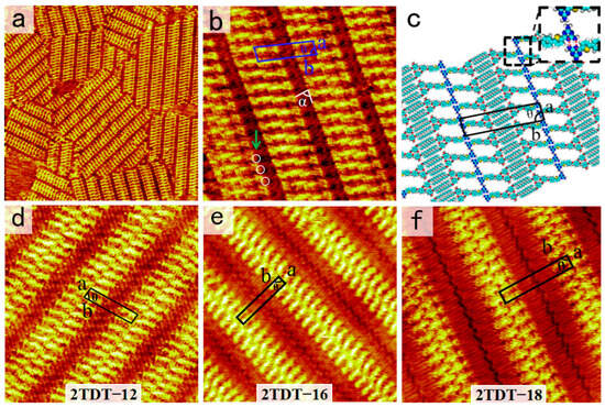 To verify further whether the chain length influences molecular self-assembly as a domain factor, molecules (2TDT−16 and 2TDT−18) with longer side chains are used, and their self-assembled nanostructures at the OA/HOPG interface were also observed, respectively (Figure 3e,f). STM shows that both molecules pack into a two-row linear pattern, adopting a face-to-face arrangement. The STM results indicate that the length of the side chain is a key factor in determining the molecular packing arrangement.