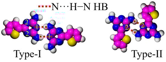 DT units with strong polarity greatly affect the adlayers of DT derivatives on the highly ordered pyrolytic graphite surface [28,29]. Meijer et al. reviewed many related studies on DT derivatives by varying the ratio between the π-conjugated backbone and the length of the aliphatic chain. They provided a detailed explanation of the typical arrangement of the DT moiety [15,27,29,38]. Our previous experiments also showed other arrangements of the DT moiety [26], though only two types of arrangements are discussed in this paper. To better distinguish the arrangement of DT units, three nitrogen atoms in each DT are labeled as positions 1 and 2 (Figure 4). Dimer I takes a typical face-to-face fashion at the 1,1 sites (Type-I), binding with a couple of N···H−N HBs, which are the main interactions creating the cross-shaped pattern in DT−10 and the four-leaf-shaped pattern in 2TDT−10. Dimer II, bonded at 2,2 sites (Type-II), mainly appears in a two-row linear pattern in DT−12 and 2TDT−12 adlayers [28].