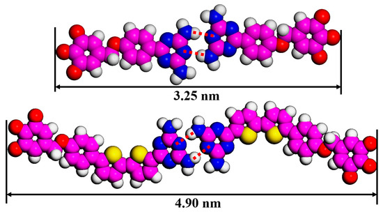 Measured backbone length of DT−10 and 2TDT−10 in dimers. Carbon atoms are represented in pink, hydrogen atoms in white, nitrogen atoms in blue, sulfur atoms in yellow, respectively.