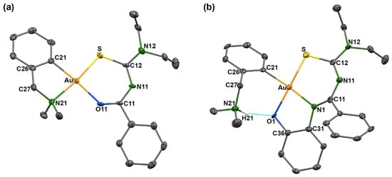 A larger number of stable Au(III) complexes are available through a combination of the above-mentioned organometallic approach with chelating ligands [,,]. Of particular interest are those with coordinated 2-(dimethylaminomethyl)phenyl (damp−) ligands [,,,,,,,]. The resulting complexes are of interest as potential anti-cancer or anti-parasital drugs [,,]. In the present communication, we report the reactions of [Au(damp-κC1,N)Cl2] with the bidentate benzoylthiourea derivative HL1 and the potentially tridentate thiocarbamoyl benzamidine H2L2. Both ligands are depicted in Figure 1.
