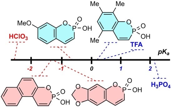 - Zalaltdinova, A.V.; Sadykova, Y.M.; Gazizov, A.S.; Smailov, A.K.; Syakaev, V.V.; Gerasimova, D.P.; Chugunova, E.A.; Akylbekov, N.I.; Zhapparbergenov, R.U.; Appazov, N.O.; et al. Superelectrophilic Activation of Phosphacoumarins towards Weak Nucleophiles via Brønsted Acid Assisted Brønsted Acid Catalysis. Int. J. Mol. Sci. 2024, 25, 6327. [Google Scholar] [CrossRef] [PubMed]