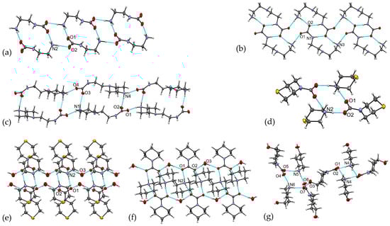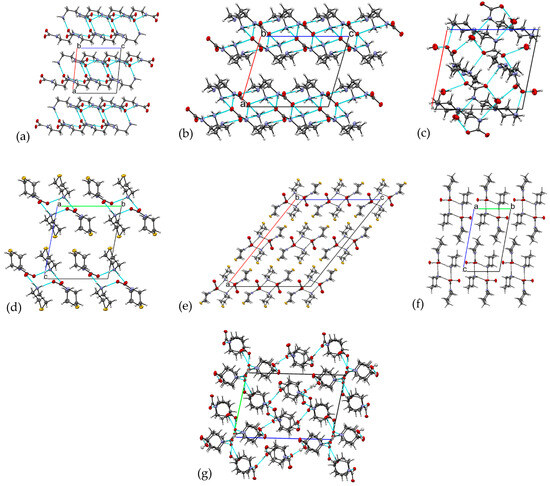 Packing motifs in 1–7. (a) Packing of the H-bonded layers in 1; (b) packing of H-bonded layers in 2; (c) 3D H-bonded network in 3; (d) packing of H-bonded tetramers in 4; (e) packing of H-bonded chains in 5; (f) packing of H-bonded chains in 6; (g) 3D H-bonded network in 7.