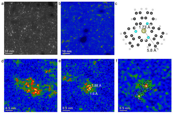 (a,b) STEM images of fac-Ir(ppy)3 molecular clusters. (c) A projected structure model of the fac-Ir(ppy)3 molecule. (d,e) Typical atomically resolved STEM images show different aggregation status of the fac-Ir(ppy)3 molecules. (f) STEM image shows the single molecule of the fac-Ir(ppy)3 with superimposed molecular structure.