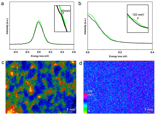 (a,b) Electron energy loss spectroscopy (EELS) of the fac-Ir(ppy)3 at the single-molecula region (black) and molecular cluster region (green). (c) Colored STEM-HAADF image of fac-Ir(ppy)3 molecular clusters. (d) EELS mapping of the vibration-related energy of molecular clusters using the 100–140 meV peak region.