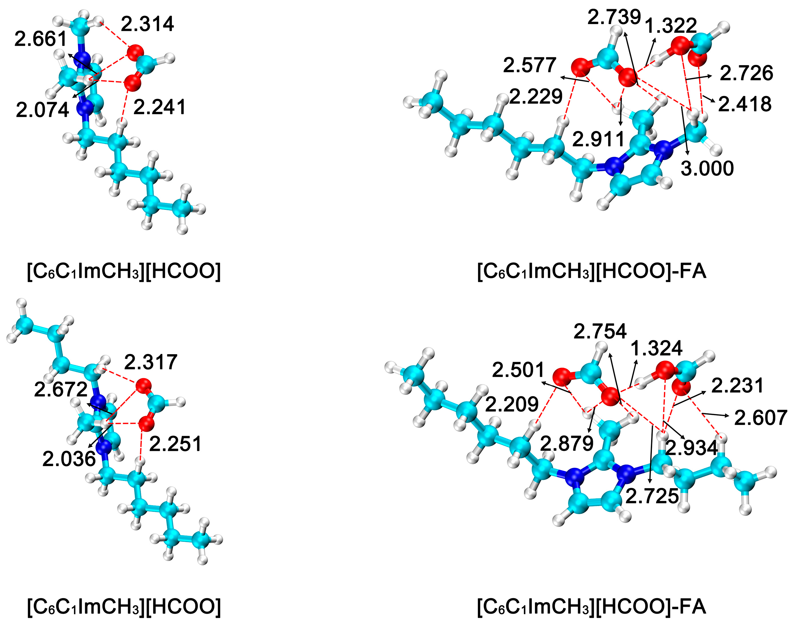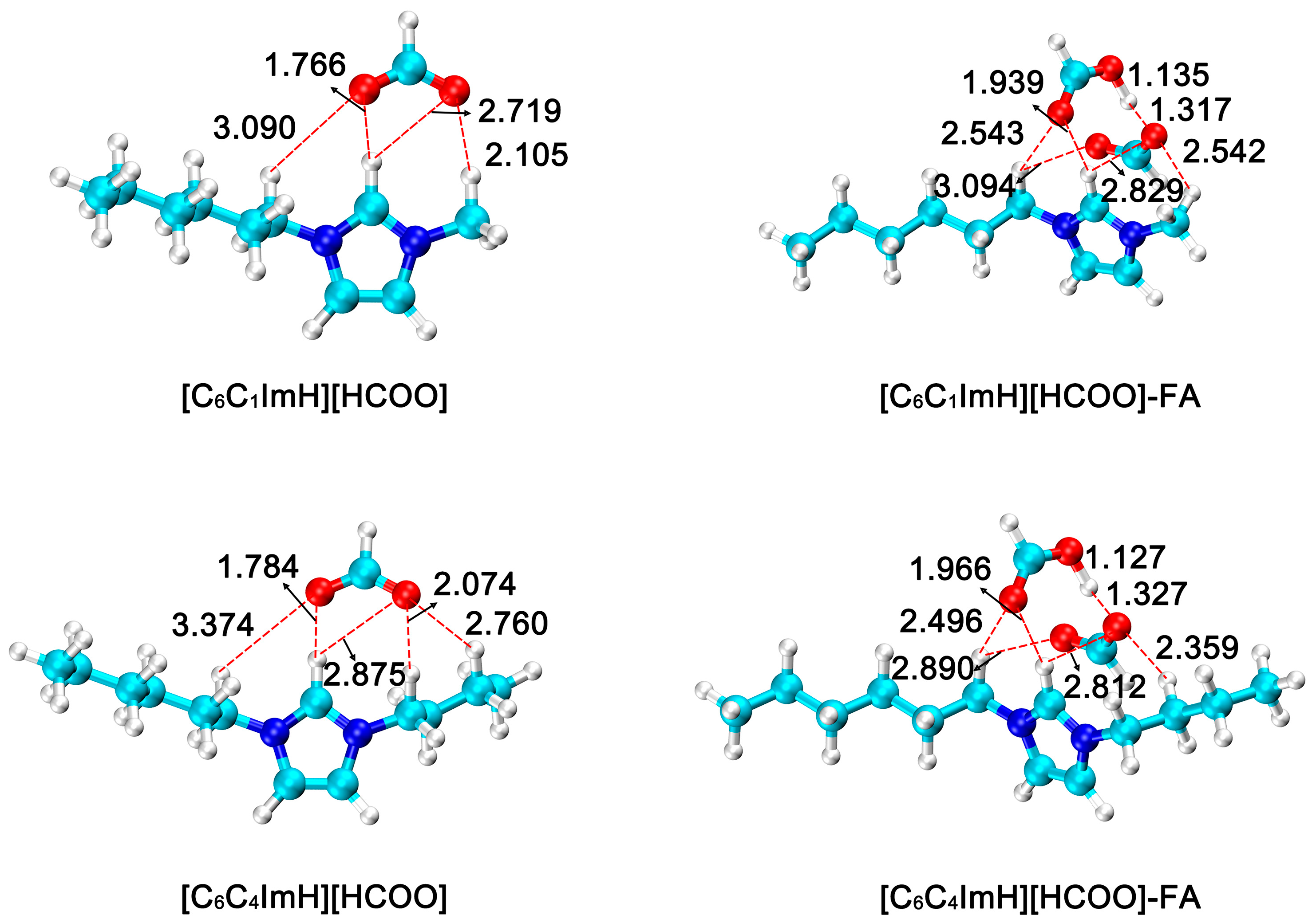 Based on the stabilizing effect of imidazolium formate ionic liquid on FA, the effect of cationic R3 substituent structure on FA stabilization was investigated in this study. After replacing the substituent at the R3 position from H to methyl. Six different imidazolium formate ionic liquids [C2C1ImCH3][HCOO], [C2C4ImCH3][HCOO], [C4C1ImCH3][HCOO], [C4C4ImCH3][HCOO] and [C6C1ImCH3][HCOO] were obtained, and then the FA product was stabilized by forming intermolecular hydrogen bonds. The optimized geometries of all species in this process is shown in Figure 5. In the ionic liquid–formic acid adduct, the hydrogen bond lengths formed by anions and FA in the ionic liquids are 1.320 Å, 1.322 Å, 1.322 Å, 1.325 Å, 1.322 Å, and 1.324 Å, respectively.