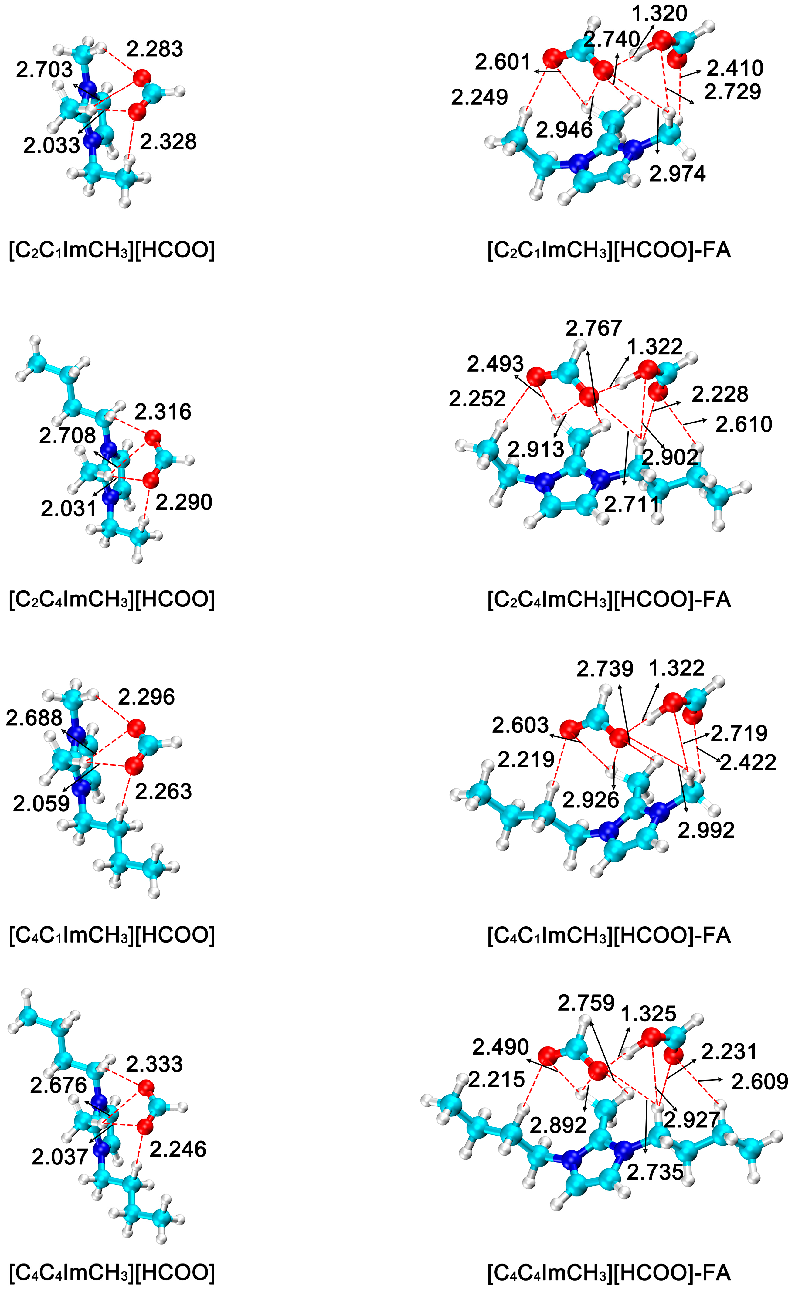 For ionic liquids, the structure of the anion is equally important. Sans et al. obtained the highest catalytic activity observed to date for an alkali-free system using an imidazolium acetate ionic liquid [39]. Similarly, Hu et al. also facilitated the direct generation of FA from imidazolium bicarbonate ionic liquid [40]. Therefore, we investigated the effect of different anions on the molecular stabilization of FA. Three anions that have been experimentally proven to stabilize FA are used: formate anion, acetate anion, and bicarbonate anion The optimized geometries of all species in the process of FA stabilization by imidazolium formate ionic liquid is shown in Figure 3. The optimal geometries of all species in the process of FA stabilization by imidazolium acetate ionic liquid and imidazolium bicarbonate ionic liquid are shown in Figures S3 and S4 in the Supporting Information.