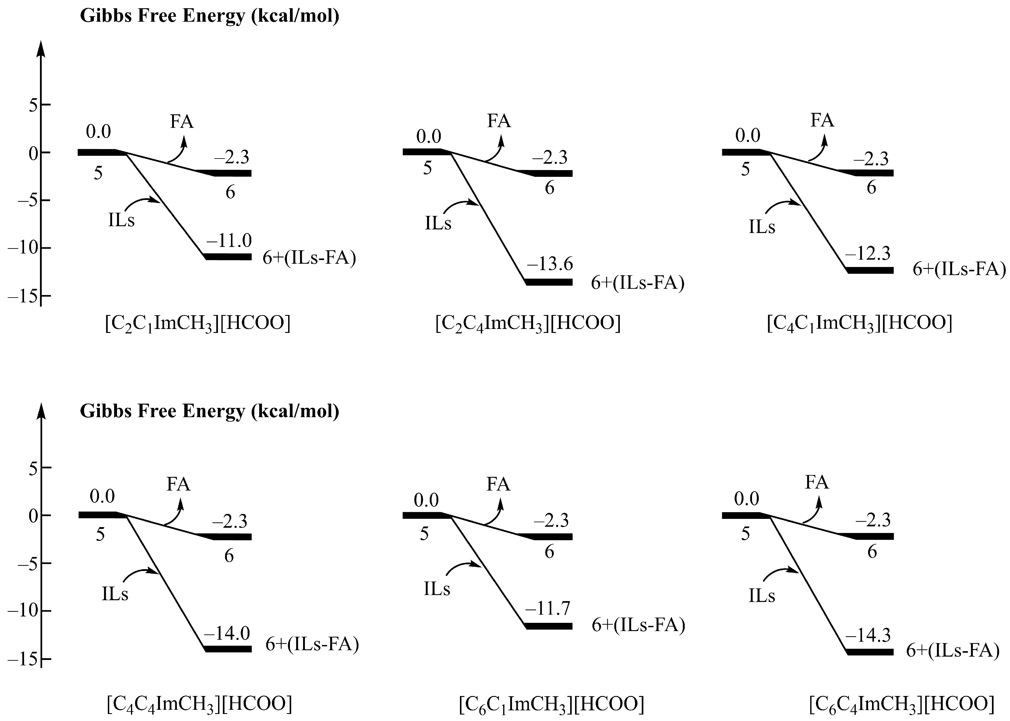 In addition, based on the fact that ILs can be functionalized by manipulating the pairing of cations and anions [47], we first investigated the effect of substituents on cations on the FA stabilization process. Two other ionic liquids that have been experimentally proven to stabilize FA, imidazolium acetate ionic liquid and imidazolium bicarbonate ionic liquid, were then considered. To elucidate the interactions between the ionic liquid and the formic acid molecule and to determine the respective roles of the cation and anion on the stabilization order, we compared the binding free energies of the ionic liquids with formic acid, as presented in Scheme 2.